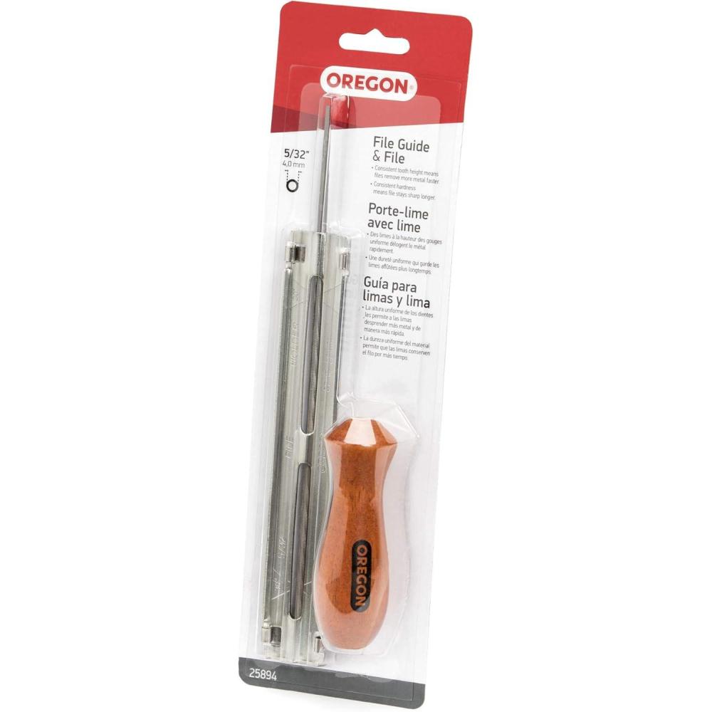 This Oregon file guide with files eliminates guesswork and keeps chain at peak cutting efficiency. The filing guide is inscribed with angle indicators to maintain proper file position. Kit contains two premium files with a handy sharpening guide.