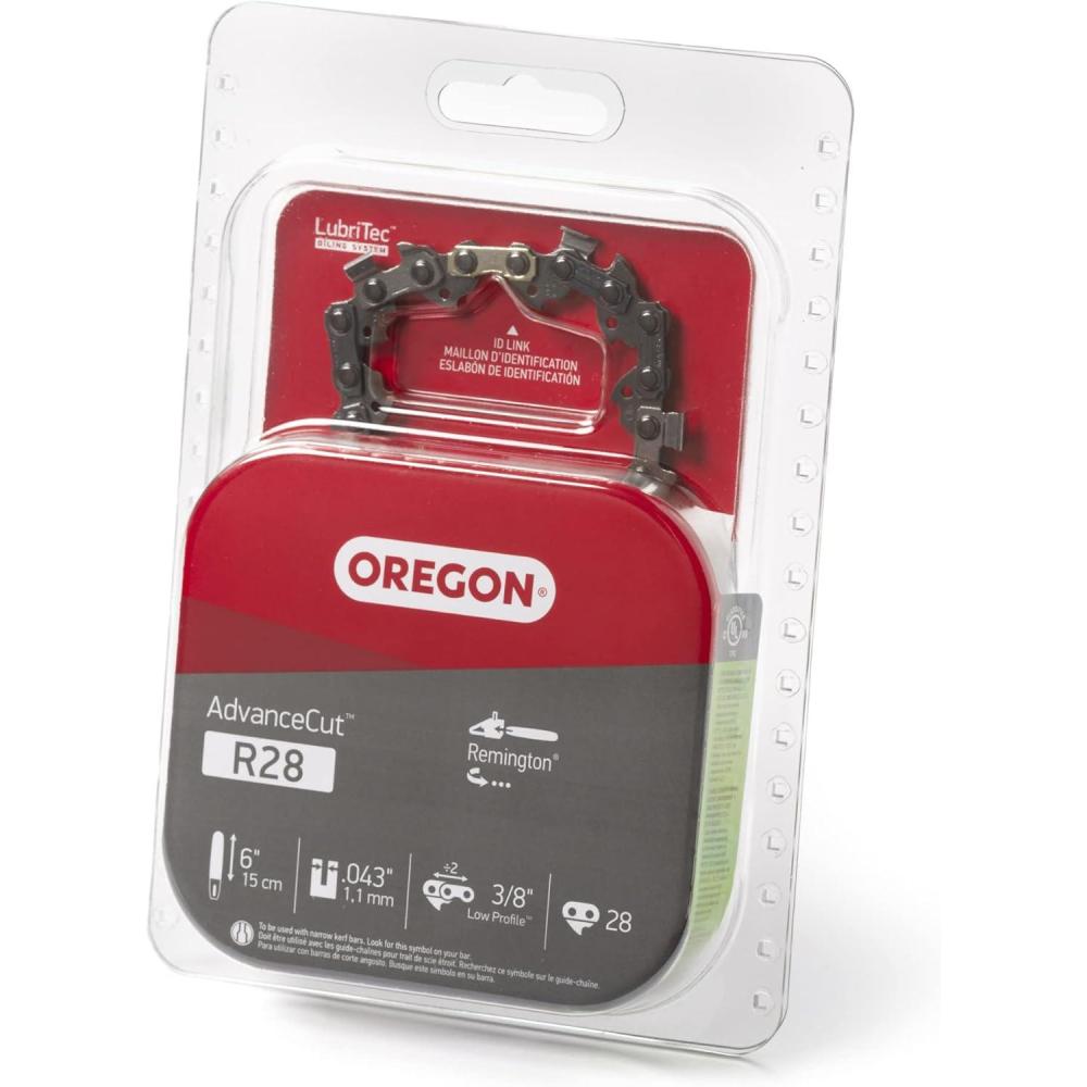 The Oregon AdvanceCut R28 replacement 6-Inch Chainsaw Chain is designed to fit a variety of small pole saw models, and features a 28 drive link chain with 3/8-inch pitch and .043-inch gauge. This makes the spare pole saw chain suitable for occasional commercial users, regular yard work and DIY. It offers higher chain efficiency, making it ideal for landscapers and homeowners who use compact, low powered saws such as battery powered. The .043″ gauge narrow kerf cutting systems increase efficiency since they need less power from the saw than standard cutting systems. The low-vibration micro chisel cutters offer excellent performance, easy maintenance and low kickback for better safety. The premium quality, lightweight and long lasting chain features top-plate filing indicators, to make accurate sharpening easier. For pole saw sizes up to 42 cc. Always use narrow kerf chain in combination with narrow kerf designed bars. This saw chain met the kickback performance requirement of ANSI B175.1-2012 and CSA Standard Z62.3. Features LubriTec – Oregon's next-generation oiling system, designed to extend the guide bar and saw chain life. Compatible with many saw chain makes and models, including (but not limited to): CRAFTSMAN CMCCSL621D1 MILWAUKEE 2527-20, M12 REMINGTON 11409-01 POLE SAW, Branch Wizard 111409-01, RM0612P. Saw chain identification: Always refer to the number stamped on the drive link of your old chain to assure correct gauge and pitch, or refer to your owner’s manual, to order the correct part to fit your saw chain. • Chain gauge is the drive link's thickness where it fits into the guide bar groove, matching the guide bar gauge • Chain pitch is the size of the chain and is defined as the distance between any three consecutive rivets divided by 2 • Your guide bar length is stated in the manual, and is the length of the long bar from end to tip (not the full length of the chainsaw). See Oregon’s fitting guide.