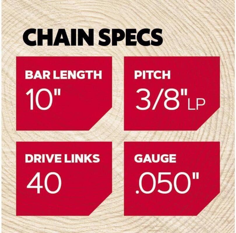 Designed to fit most chainsaw models that require a 3/8 Inch low-profile pitch, .043 Inch (1.1 mm) gauge, 55 drive links Fits: Craftsman/Sears – 172.43983, 358.35083, 358.35514 Earthwise – CPS40110, LCS32010, LPS4210, PS40010 Echo – CS-27IT, CS-3000, PPF-225*, PPF-280*, PPT-265, PPT-265S*, PPT-266, PPT-280* (*Only when used with Oregon branded bars) Greenworks – 10in/20V/Li-ION, 2000102 24V Li-Ion, 20262 40V Li-ION, 20292 40V Li-ION, 20362 24V Li-ION, 7A 2-in-1 Pole Saw 20062 Poulan – 1800, 2000, 2300, Micro 25 XXV Series Remington – Pole Saw: 106821A, 106890-01, 106890-02, PS1510A, RM1015PS, RM1025P, RM1025SPS Troy-Bilt – TBCS57 Worx – WG309 Sun Joe – 20ViON-CS10, SWJ803E, SWJ807E Attention: This saw chain met the kickback performance requirement of ANSI B175.1-2012 when tested according to the provisions of ANSI B175.1-2012. Low-kickback saw chain meets the kickback performance requirement of CSA standard Z62.3.